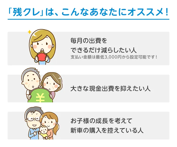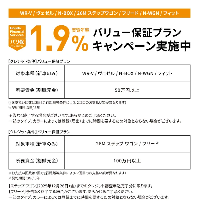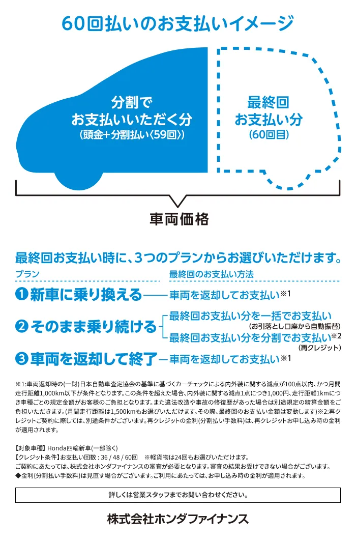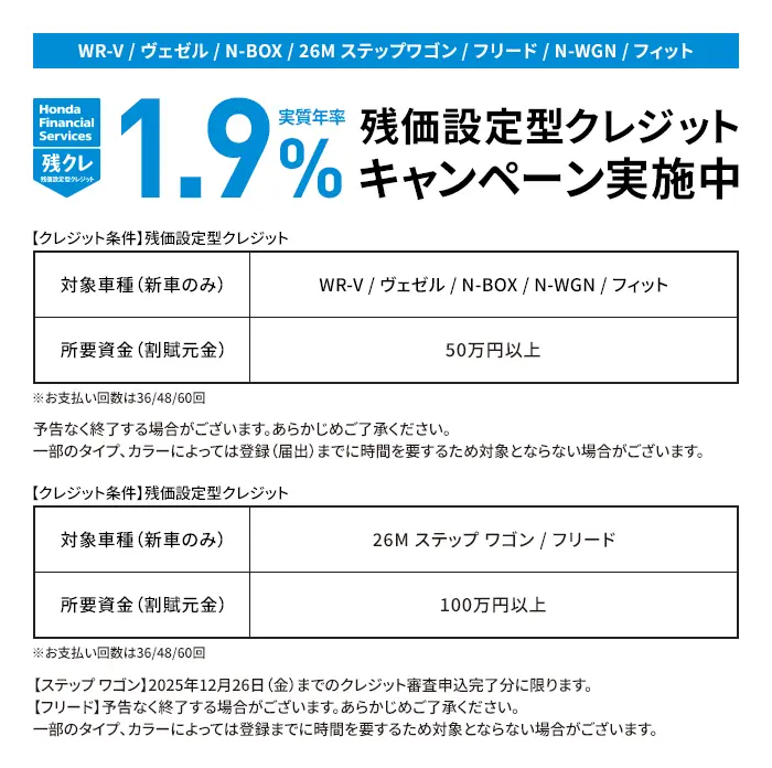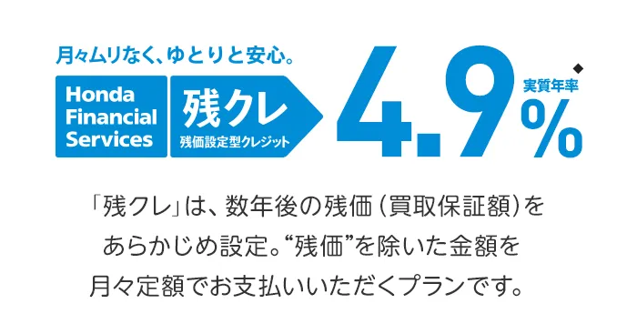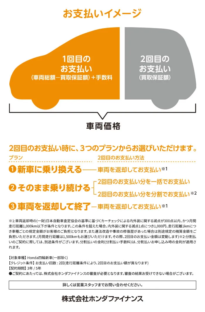 〔残価設定型クレジットのお支払い例について〕下記お支払い例は2025年12月の一例です。下記お支払い例は、初回お支払い月を2026年2月、初回ボーナス月を2026年7月(以下ボーナス月は1月・7月)で計算した一例です(ボーナス月は設定がある車両に限る)。※本クレジットは最終回に、@新車に乗り換え、A乗り続ける(最終回お支払い額を一括または再クレジットでお支払い)、B車両を返却 のいずれかをお選びいただけます。@、Bの場合、内外装キズや走行距離などの確認事項があります。事前に定めた条件を超える場合には、その差額分を別途ご負担いただきます。詳しくは営業スタッフまでお問い合わせください。