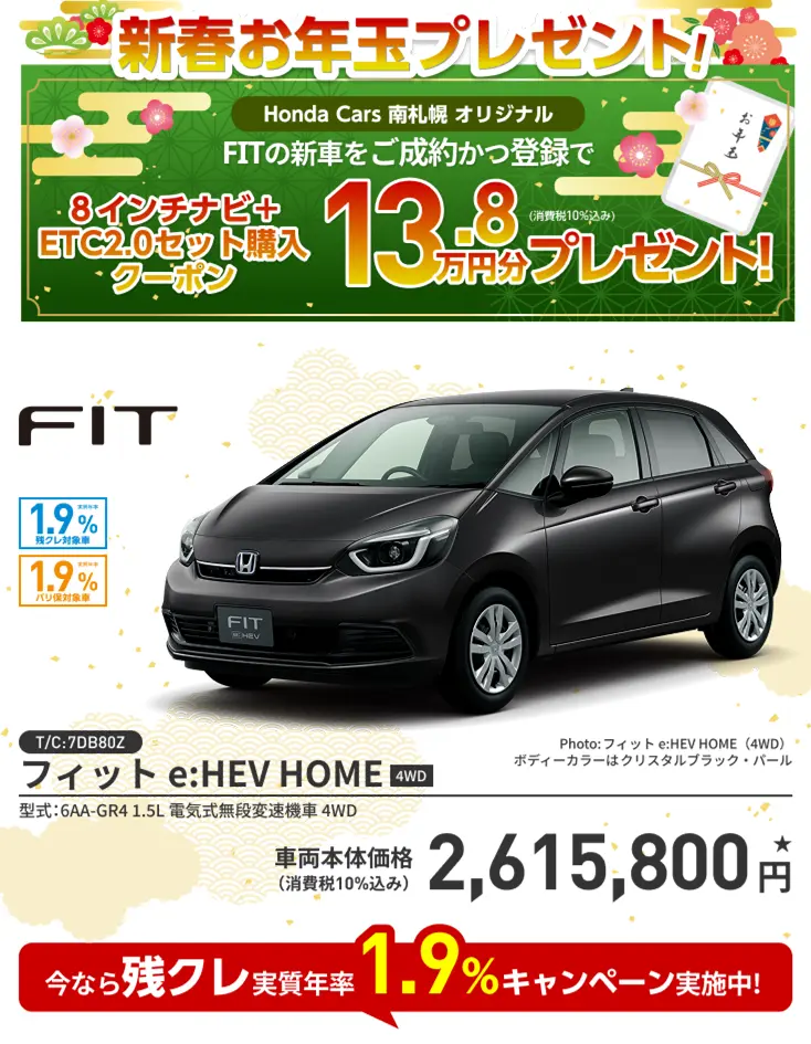 【FITキャンペーンについて】■期間中に当店にてFITを新車でご成約かつ登録いただいた方が対象となります。■一部のタイプ、カラーによっては登録までに時間を要するため対象とならない場合がございます。■クーポンは対象車種の8インチナビ+ETC2.0車載器セットにご使用いただけます。■クーポンはご成約いただいた販売店でのみ有効です。■在庫状況によっては適用にならない場合がございます。■工賃・取付アタッチメント費はご成約者様のご負担となる場合がございます。■クーポン金額を超える代金は、ご成約者様のご負担とさせていただきます。また、総額がクーポン金額に満たない場合の返金、値引きはありません。■ETC2.0車載器を使用するには、別途決済用のETCカード、セットアップ作業(セットアップ費用)が必要となります。■キャンペーン内容は予告なく変更する場合がございます。あらかじめご了承ください。■当プレゼントキャンペーン権利の他人への譲渡や換金、値引きはできません。■他のキャンペーンと併用できない場合がございます。■Honda Cars 南札幌にて実施しております。■詳しくは営業スタッフまでお問い合わせください。