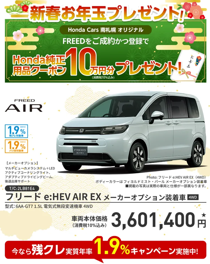 【FREEDキャンペーンについて】■期間中に当店にてFREEDを新車でご成約かつ登録いただいた方が対象となります。■一部のタイプ、カラーによっては登録までに時間を要するため対象とならない場合がございます。■クーポンは対象車種のHonda純正アクセサリー車種サイトに掲載されているHonda純正用品(Hondaカーケアメニュー、ケミカル用品<一部>除く)にご使用いただけます。■クーポンはご成約いただいた販売店でのみ有効です。■クーポン金額を超える代金は、ご成約者様のご負担とさせていただきます。また、総額がクーポン金額に満たない場合の返金、値引きはありません。■キャンペーン内容は予告なく変更する場合がございます。あらかじめご了承ください。■当プレゼントキャンペーン権利の他人への譲渡や換金、値引きはできません。■他のキャンペーンと併用できない場合がございます。■Honda Cars 南札幌にて実施しております。■詳しくは営業スタッフまでお問い合わせください。
