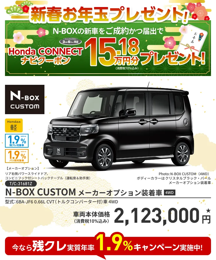 【N-BOXキャンペーンについて】このキャンペーンは予告なく終了する場合がございます。あらかじめご了承ください。■クーポンは対象車種のHonda CONNECTナビにご利用いただけます。■一部のタイプ、カラーによっては届出に時間を要するため対象とならない場合がございます。■詳しくは販売会社までお問い合わせください。■N-BOX(CUSTOM/JOY含む)を新車でご成約かつ届出いただいた方が対象となります。■クーポンはご成約いただいた販売店でのみ有効です。■ナビの種類・在庫状況によっては適用にならない場合がございます。■工賃・取付アタッチメント費はご成約者様のご負担となる場合がございます。■クーポン金額を超える代金は、ご成約者様のご負担とさせていただきます。また、総額がクーポン金額に満たない場合の返金、値引きはありません。■当キャンペーン権利の他人への譲渡や換金、値引きはできません。■プレゼントはご成約された車を対象として取付けします。■他のキャンペーンと併用できない場合があります。