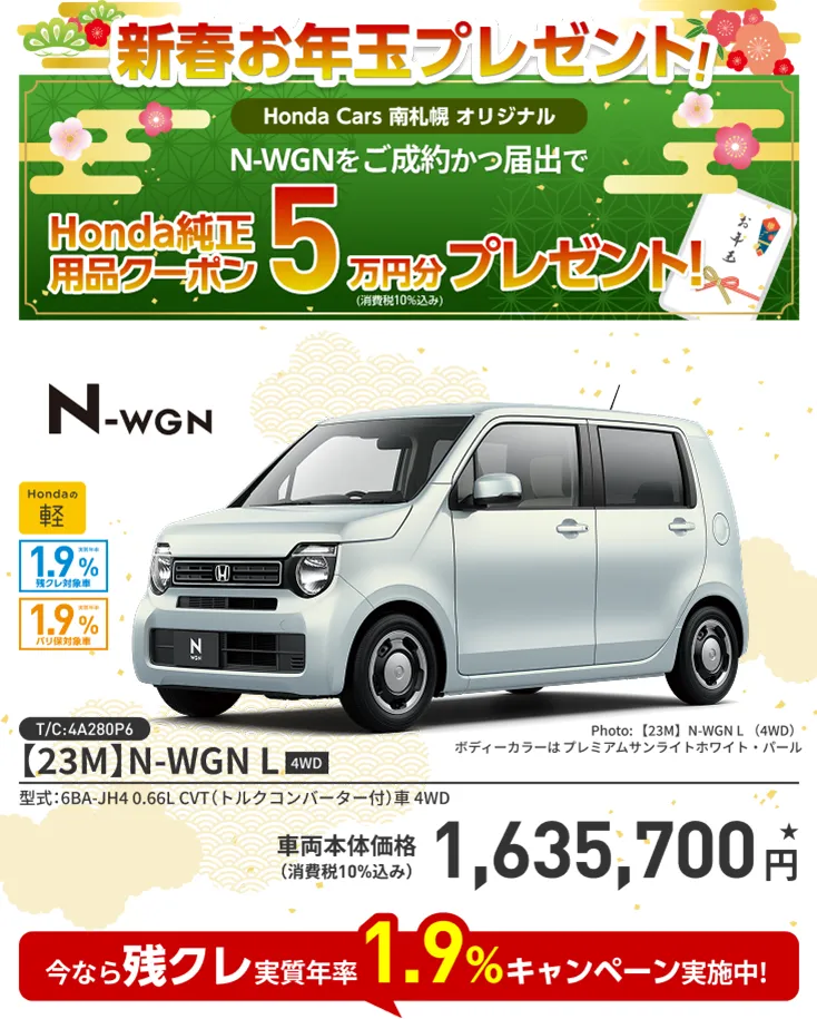 【N-WGNキャンペーンについて】■期間中に当店にてN-WGNを新車でご成約かつ届出いただいた方が対象となります。■一部のタイプ、カラーによっては届出までに時間を要するため対象とならない場合がございます。■クーポンは対象車種のHonda純正アクセサリー車種サイトに掲載されているHonda純正用品(Hondaカーケアメニュー、ケミカル用品<一部>除く)にご使用いただけます。■クーポンはご成約いただいた販売店でのみ有効です。■クーポン金額を超える代金は、ご成約者様のご負担とさせていただきます。また、総額がクーポン金額に満たない場合の返金、値引きはありません。■キャンペーン内容は予告なく変更する場合がございます。あらかじめご了承ください。■当プレゼントキャンペーン権利の他人への譲渡や換金、値引きはできません。■他のキャンペーンと併用できない場合がございます。■Honda Cars 南札幌にて実施しております。■詳しくは営業スタッフまでお問い合わせください。