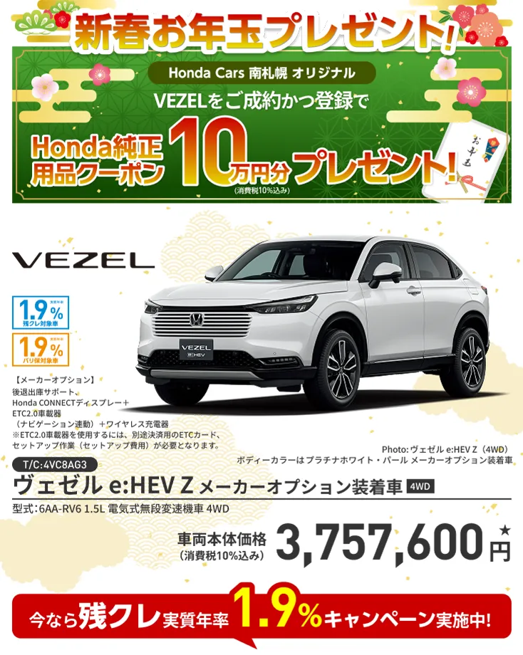 【VEZELキャンペーンについて】■期間中に当店にてVEZELを新車でご成約かつ登録いただいた方が対象となります。■一部のタイプ、カラーによっては登録までに時間を要するため対象とならない場合がございます。■クーポンは対象車種のHonda純正アクセサリー車種サイトに掲載されているHonda純正用品(Hondaカーケアメニュー、ケミカル用品<一部>除く)にご使用いただけます。■クーポンはご成約いただいた販売店でのみ有効です。■クーポン金額を超える代金は、ご成約者様のご負担とさせていただきます。また、総額がクーポン金額に満たない場合の返金、値引きはありません。■キャンペーン内容は予告なく変更する場合がございます。あらかじめご了承ください。■当プレゼントキャンペーン権利の他人への譲渡や換金、値引きはできません。■他のキャンペーンと併用できない場合がございます。■Honda Cars 南札幌にて実施しております。■詳しくは営業スタッフまでお問い合わせください。
